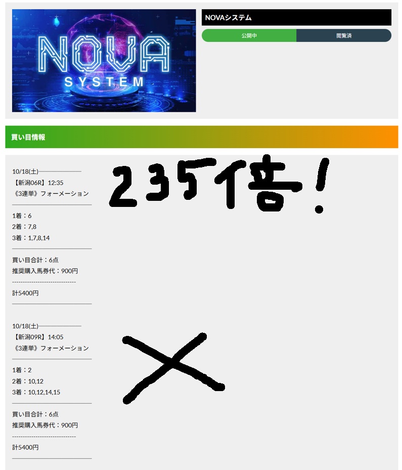 先週の18.19日にNOVAという予想を初めて使いまして、土曜日新潟6レースで3連単235.7倍当たりまして21万2130円獲得できました!新潟9レースは不的中だったんですが、馬券代5400円だけなので結局20万以上利益として残り、大満足の結果でした!