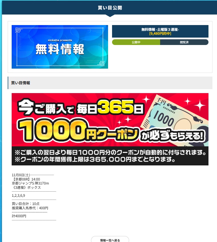 11月末のことですが、素晴らしい4鞍的中をいただけました。 参加したくても枠数の問題で参加出来ない事が多いですが、それでも結果としてプラスなので文句なしです。 シンケイバの無料予想はこちら