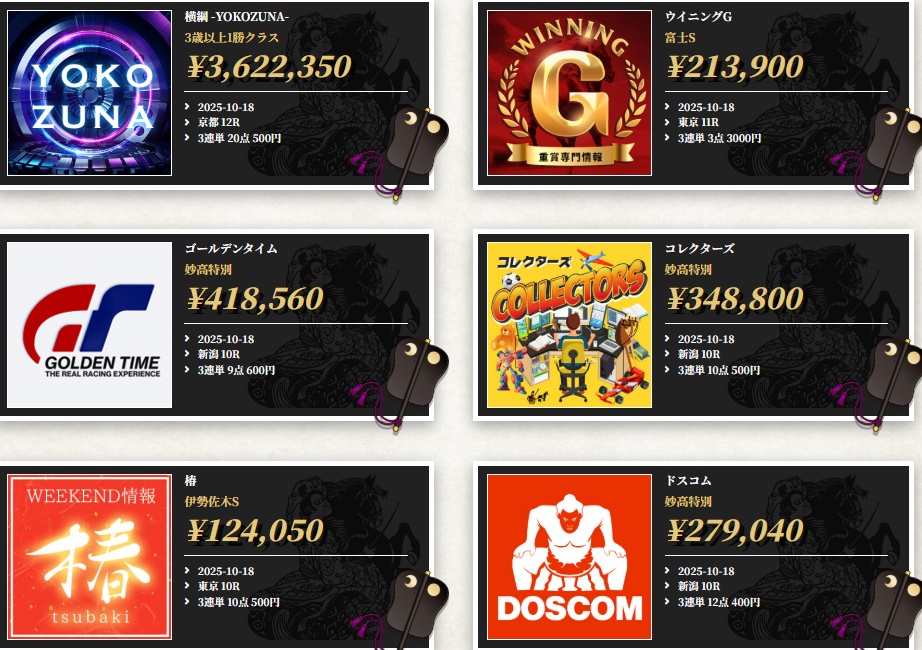的中実績から画像送ります!右上のウイングGプランで富士S3連単的中して21万獲得できました!最高の気分です!!
